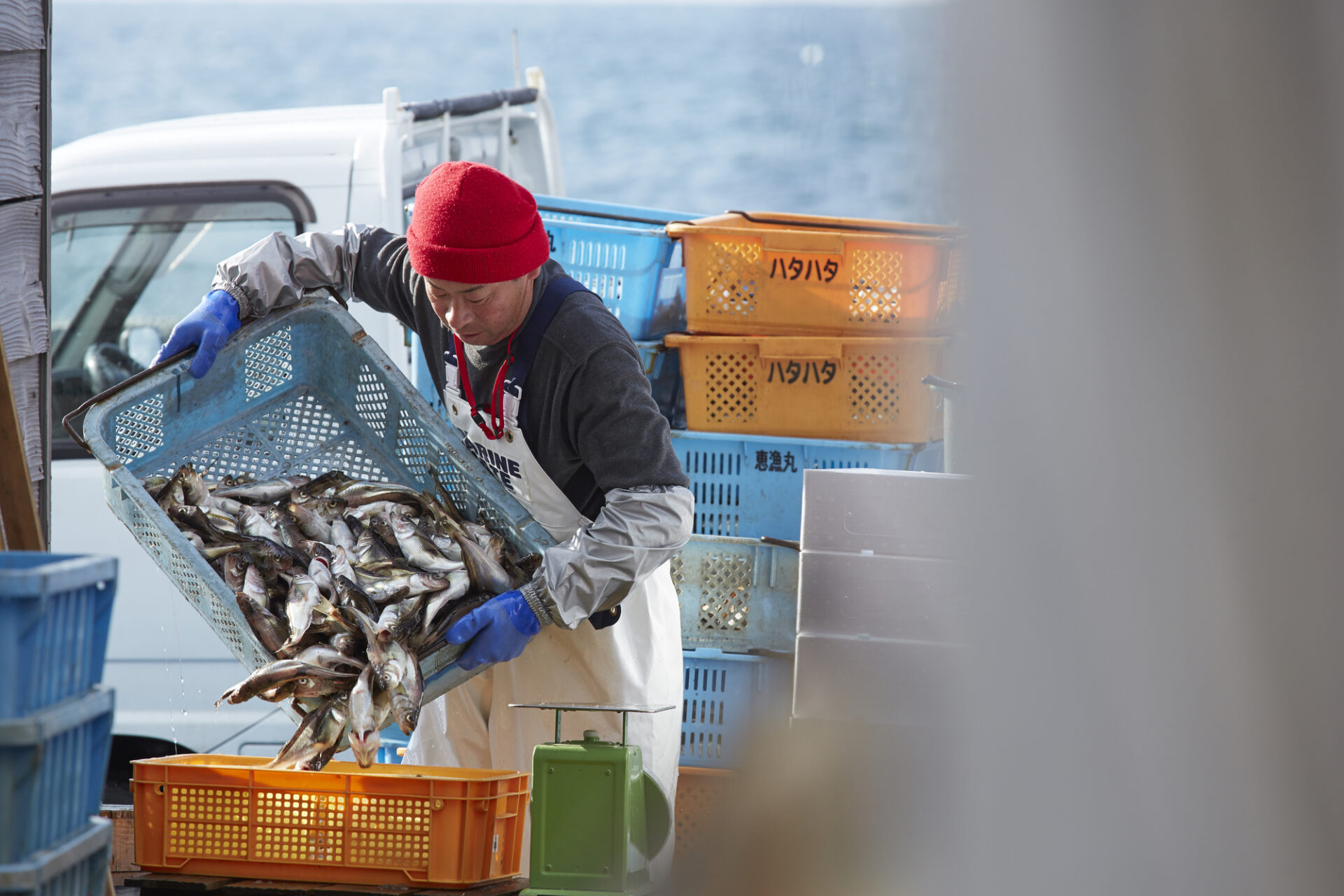 早出、仕入れた魚の仕分け